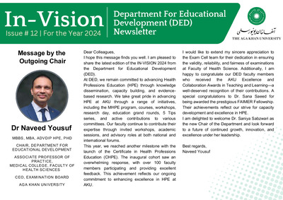 In-vision is a quarterly Newsletter of The Department for Educational Development (DED); the aim is to orient the AKU faculty and staff with DED’s achievements, upcoming events and activities. It serves to connect us with others and is an invaluable tool of communication for our stakeholders.